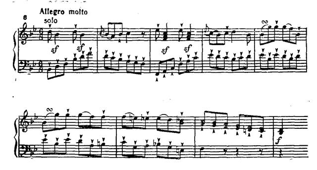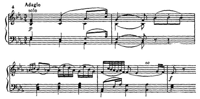 Тут мы впервые встречаемся с приемом регистрового отдаления мелодии от баса, что станет специфически бетховенским средством интенсификации лирической выразительности путем расширения «объемности» звучания.