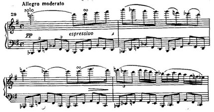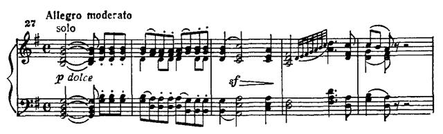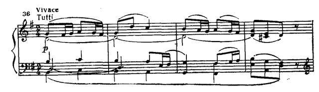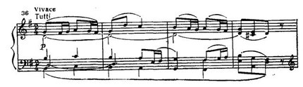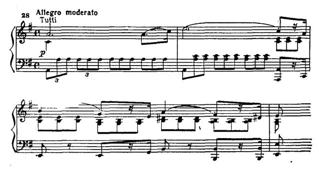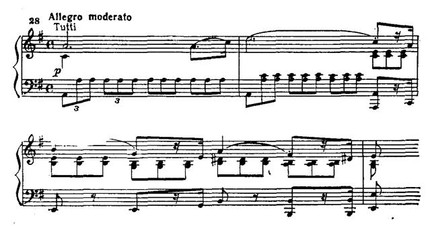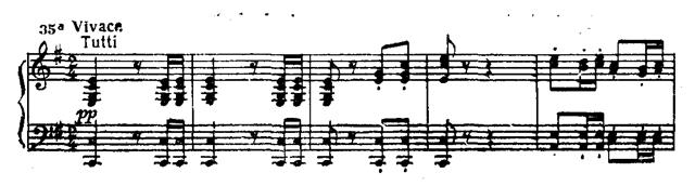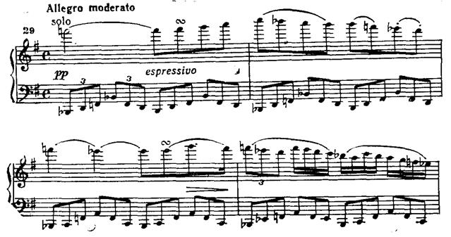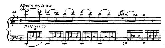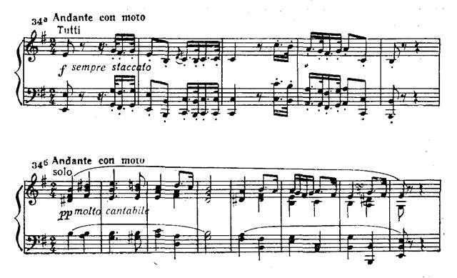 В главной партии последовательно применен принцип концертного сопоставления tutti — solo. Струнные pianissimo интонируют тему (прим. 35а). Фортепиано, повторяя ее, привносит синкопированный акцент в сопровождение, виолончель «тянет» выдержанную ноту, образуя так называемый волыночный бас (прим. 35б).