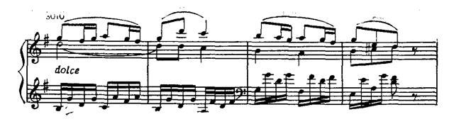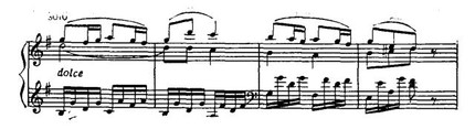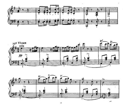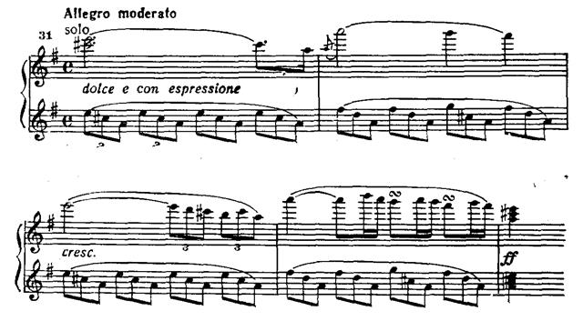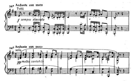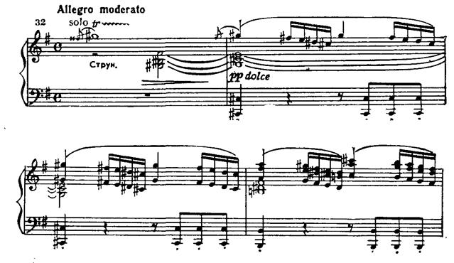 Затем, также чередуясь, струнные и фортепиано исполняют певучий отыгрыш: