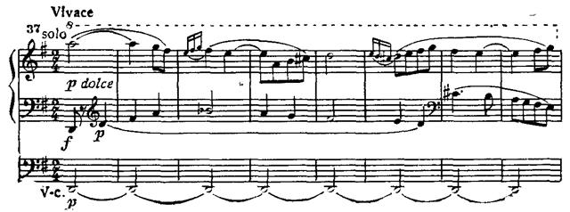 Оркестр (струнные) вступает, казалось бы, с той же темой, что и солист. Но ладовая перекраска мелодии — вместо первоначального G-dur — H-dur — привносит иной оттенок, обновлено и ее продолжение, однако ритмическая структура сохраняется. И хотя ответ струнных звучит pianissimo, в нем слышится скрытое противодействие лирическому высказыванию солиста. Так бетховенский диалогический принцип вновь проявляется не только в сопоставлении тематизма, но и в его образном переосмыслении.