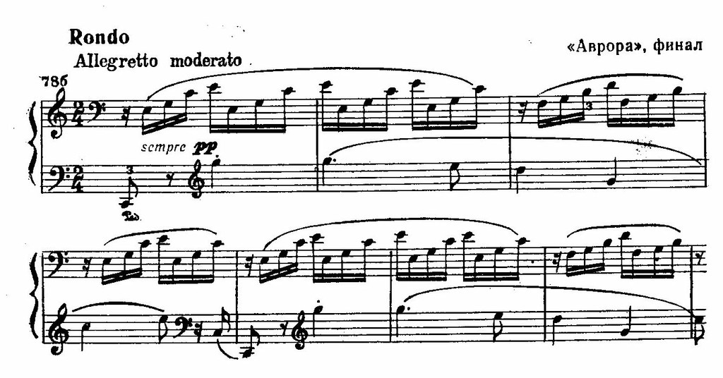 Героико-трагическая линия, последовательно проходящая через все фортепианное творчество Бетховена, ни в какой мере не исчерпывает его образное содержание. Как уже указывалось выше, бетховенские сонаты вообще нельзя свести даже к нескольким господствующим типам. Упомянем лирическую линию, представленную большим количеством произведений. Вторая соната A-dur — светлая, безмятежная, с тонкими красочными эффектами и глубоким психологизмом второй части — начинает «лирико-пасторальную» линию бетховенского творчества, дальнейшее развитие которой находим в «Пасторальной сонате» (Пятнадцатой, 1801), в «Авроре» (Двадцать первой), в четырех сонатах переходного периода (№ 24, 25, 26, 27). Вершина этой линии — Двадцать первая соната, «Аврора» C-dur (1800—1804), с ее тонким песенно-пейзажным стилем, настроением светлой гармонии. Удивительной проникновенностью чувства отличается мечтательное Adagio, с его свободной импровизационностью, мерцающим светом. Формально являясь расширенным вступлением к финалу, оно на самом деле — равноценная с ним самостоятельная часть. Это картина погруженности в мир покоя и созерцания, слияния с таинством природы. Образная сфера интродукции оттеняет по принципу контраста динамический облик финала, его «открытые» ясные тона, жизнерадостность, прекрасную в своей наивности. В основу финала Бетховен положил подлинный народный немецкий танец «гроссфатер». По сохранившимся эскизным тетрадям Бетховена можно видеть, как упорно работал композитор над народной мелодией, как менял ее, приближая к собственным требованиям. И в результате преобразовал простенький танец в тему удивительной поэтичности и красоты: