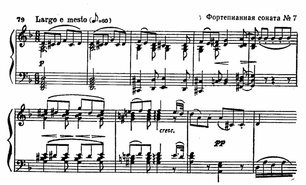 Среди ранних сонат выделяется Седьмая (опубликована в 1798 году). Первая часть напоминает симфоническое allegro по разработочному характеру тематизма, разрастающемуся звучанию; менуэт и финал проникнуты светлыми «ре-мажорными тонами». На этом фоне особенно выделяется средняя часть Largo е mesto — первое бетховенское произведение, где с такой силой отражен склад гениального музыканта-мыслителя. Какой-то своей стороной эта музыка связана с «чувствительным» стилем XVIII века; многие ее обороты перекликаются с формами выражения «сентиментальной» оперы Гретри, младших сыновей Баха, Гайдна, Моцарта... Но все эти связи преломлены через призму высокой мысли и особой эмоциональной глубины. В Largo господствует возвышенное настроение, отрешенное от всего обыденного, личного, чувственного. Вдохновенно льющаяся мысль выражена строгими чистыми линиями, сдержанным звучанием. Обращает на себя внимание рельефность тематизма и особенная целостность формы. При этом весомость каждого мелодического звука, каждого голоса, спрятанного в фактуре, преображает как будто простую пьесу в звуковое полотно огромной художественной значимости. Largo из Седьмой сонаты — скорбное размышление, философская лирика, предвосхищающая гениальный «Похоронный марш» из «Героической симфонии»:
