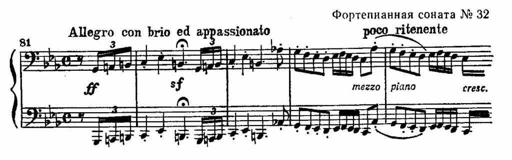 Одно из самых выдающихся творений Бетховена, его последняя, Тридцать вторая соната, являет собой чудо целостности и стройности. В ее первой части как будто оживают драматические образы «Патетической» и «Аппассионаты». И, однако, трактовка этой «вечной» бетховенской темы сейчас иная. Уже сама тема главной партии пронизана полифоническими оборотами, которые воспроизводят типичные интонации тем в контрапунктических жанрах XVII и XVIII столетий. Необычна и унисонная фактура темы, вызывающая ассоциации с линеарной структурой многоголосного письма: