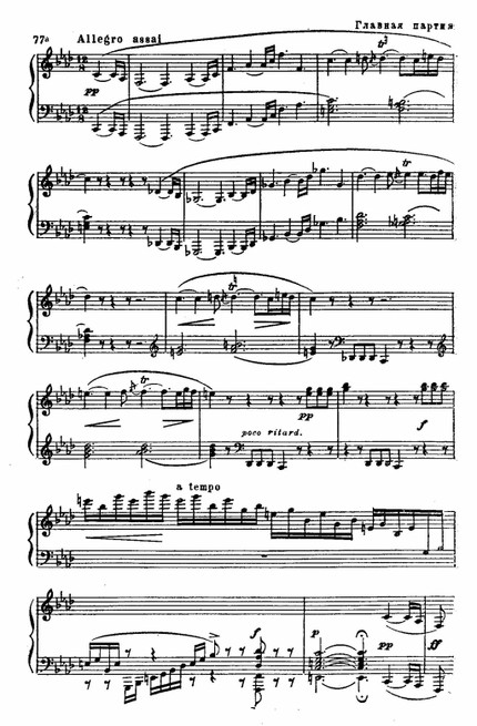 И другие приемы изложения явно воспроизводят оркестровые эффекты, например, басовое тремоло или поступательное движение темы, постепенно охватывающее все более высокие регистры (см. симфонии мангеймской школы, увертюры Керубини). Родство первой части «Патетической» с увертюрой заметно и в трактовке сонатного allegro: рельефность тем, их резкое противопоставление, тематическая сжатость и насыщенность.