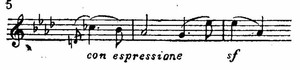 Вслед за регистровым расширением стремительно развивается заключение экспозиции. Тут синкопы связующей партии (прим. 2) стали упрямо волевыми, фанфарными (тт. 33—39), а «междометия» (прим. 4) сменились утверждениями: