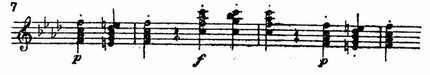 Беспокойство усиливается с момента вступления синкоп в басу и перекликающихся с ними восклицаний правой руки. Здесь перебивка ритмических акцентов настолько характерна и для позднейшего ритмического склада музыки Бетховена, часто полной неожиданных и резких контрастов, что мы приведем в виде образца небольшой отрывок:
