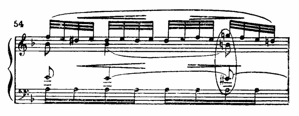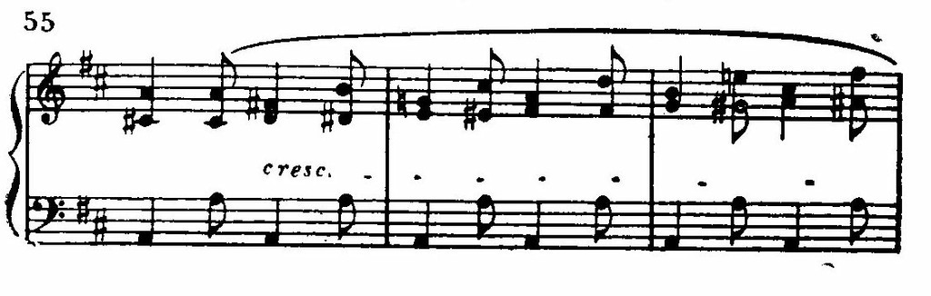 Эта новая тема (с т. 63) необыкновенно картинно развивает образ. Не устойчивая тональность, а постоянные колебания переменного лада fis-moll — A-dur (с мимолетными касаниями Cis-dur и D-dur). Этой гармонической трепетности соответствует и ритмическая — с т. 77 вступает двухголосный фон тремолирующих восьмых. Постепенно растет и ширится, то усиливаясь, то затихая, шелест леса, дважды прерываемый четырехкратными каскадами звонких сбегающих) гамм — точно струями быстрых ручьев. А в заключительной партии (с т. 135) все снова затихло,— лишь слабые звуки рогов доносятся издалека.