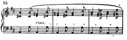 Очень примечателен указанный эпизод и в гармоническом плане. Он ведет к репризе (т. е. к ре-мажору), а дан органный пункт доминанты си-минора! Суть опять-таки в трепетности гармонических переходов, в переменном ладе (h-D): доминанта си-минора, замирающая в басовых аккордах на фермате, готовит и ре-мажор. А дальше, перед самой репризой очаровательно свежа игра гармонических красок (чередование си-мажора, си-минора и ре-мажора).