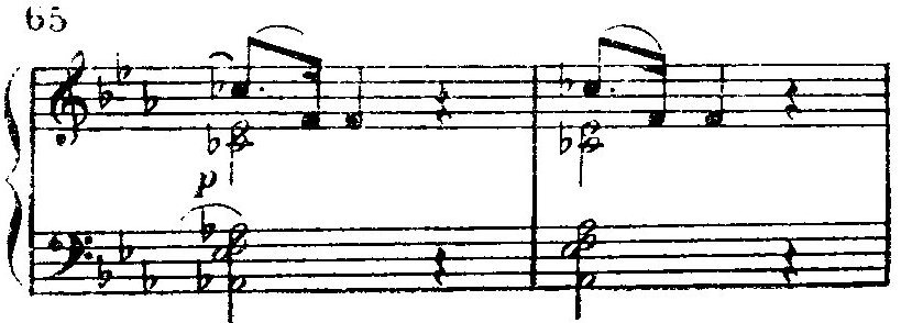 В разработке — новые эмоциональные оттенки. Мотив томления (восходящая цепь аккордов — т. 91 и д.) звучит теперь с оттенком драматизма, в нем нечто угрожающе-серьезное, требовательное. Но с переходом в фа-мажор (т. 101) опять возвращается беспечность. Проведение отрывистых групп из двух шестнадцатых в басу (т. 109 и д.) не лишено юмора, так как увеличенные нисходящие сексты (си — ре-бемоль, ми — соль-бемоль) звучат как бы хрипловато. Затем (с т. 122) появляются уверенность и рассудительность,— но лишь для того, чтобы перед репризой смениться мечтательными переливами арпеджий на секстаккорде первой ступени фа-минора (тт. 131—136), который вслед за этим модуляционно переосмысливается в секстаккорд второй ступени ми-бемоль-мажора.