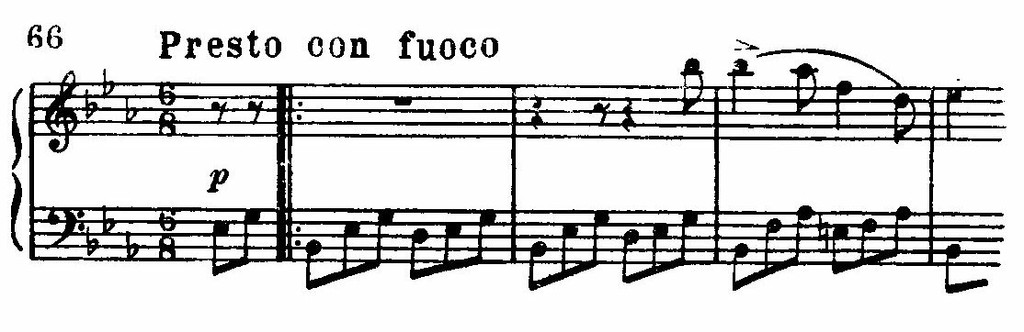 Опять эпизод томлений и снова ясный, светлый ми-бемоль-мажор (т. 17 и д.), где пунктированные группы и короткие нисходящие фразки из двух шестнадцатых получают кокетливый характер.