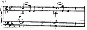 В т. 25 и последующих появляются интонации настойчивости, уверенности, даже властности. Однако в т. 33 и далее — опять томление, притом усилившееся. Квинтсекстаккорд второй ступени дан теперь с пониженной квинтой: