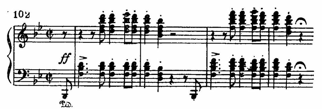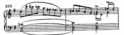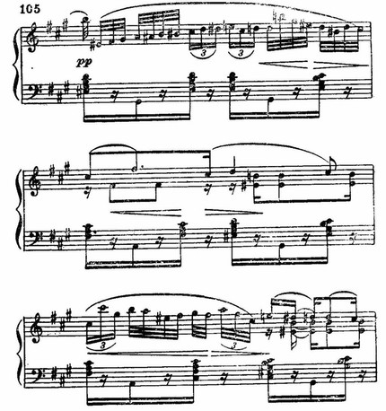 Затем стремительный взбег гаммы (Prestissimo, т. 112), краткое тремоло (Tempo I) (Это уже чисто романтический эффект внезапной «перемены декорации».) — и приходит реприза первого образа. Но простым повторением его дело не ограничивается. В коде скерцо дан очень выразительный и смелый эффект перемежающихся ударов октав (на си и си-бемоль) (Своеобразный пример многократного мелодического модуляционного сдвига.), подобных грубому вмешательству чего-то назойливого и неприятного. Краткая концовка пианиссимо (на материале первой темы) завершает причудливую музыку скерцо.