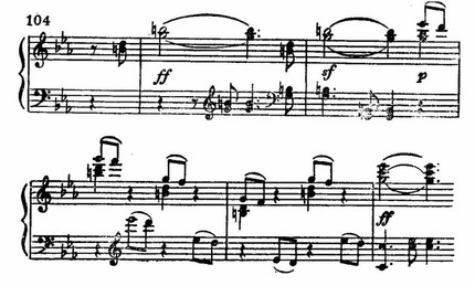 Затем новые этапы борьбы начал — нарастание (тт. 53—56), глубокие, томительные вздохи всей грудью (тт. 59—60), умиротворяющие кадансы в ре-мажоре (тт. 63—67), тревога хроматизмов (т. 78 и д.). (Здесь многое предвещает романтиков, в частности Листа.)