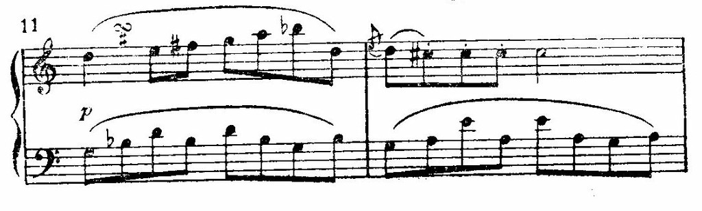 Разработка довольно коротка, но примечательна появлением нового выразительного фактора — ломаных арпеджий (с т. 97):