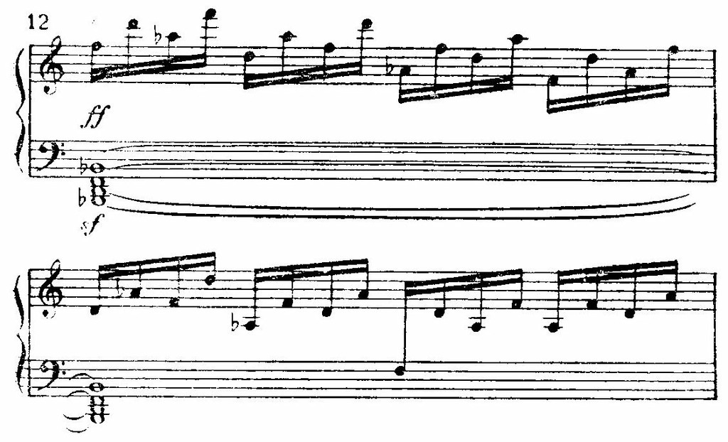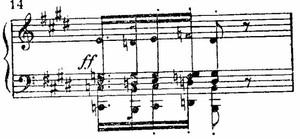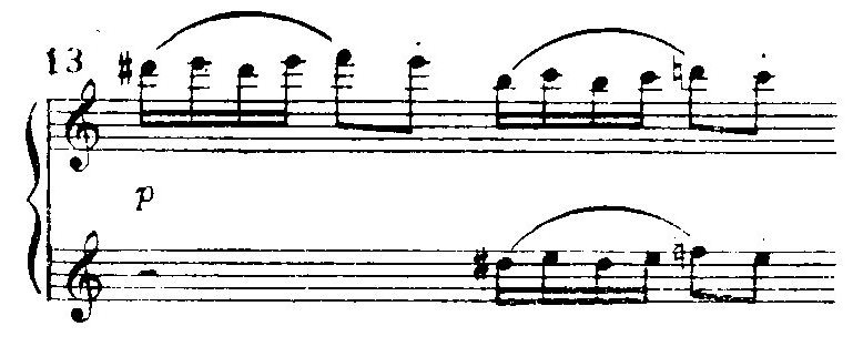 Так, в двух тактах примера 12-го (тт. 97—98) доминантовидный септаккорд звучит торжественно, празднично; в следующих двух тактах (тт. 99—100) уменьшенный септаккорд делает звучание мутным, тревожным; далее (тт. 101—102) появление минорного квартсекстаккорда привносит драматическую напряженность и т. д.