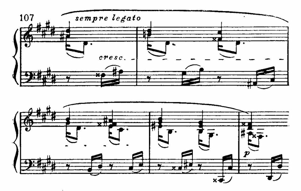 Первое из них легко, воздушно и излагается в характерном пунктированном ритме (Шестнадцатая и восьмая с точкой. Этот ритм имеет обширную традицию от клавесинистов до Дебюсси.), с выделением терций и квинт аккордов в мелодии; образное содержание этого начала пока не развернулось, но в нем уже улавливается нечто среднее между акцентами речи и звукописью природы.