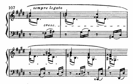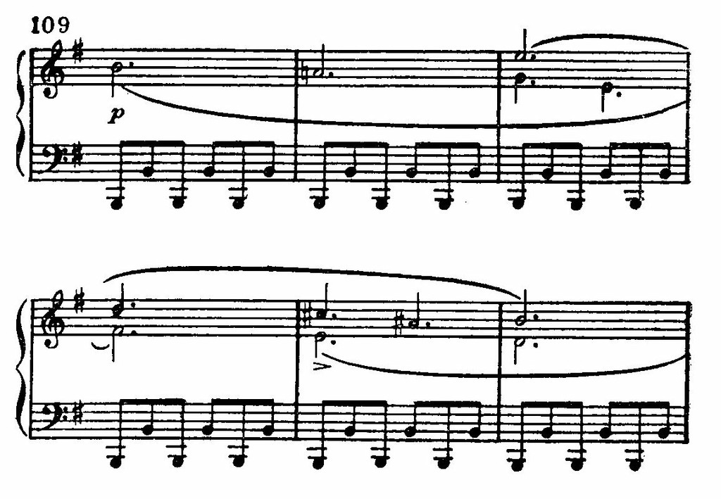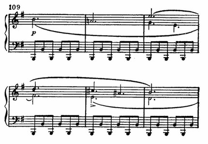 Вслед за этим — лирический подъем (где опять показательна опора на терции и квинты аккордов в мелодии). Но далее эмоциональный характер музыки ослабляется. Слышны лишь звонкие щебетания в высоком регистре и гулкие отголоски басовых разбитых октав.