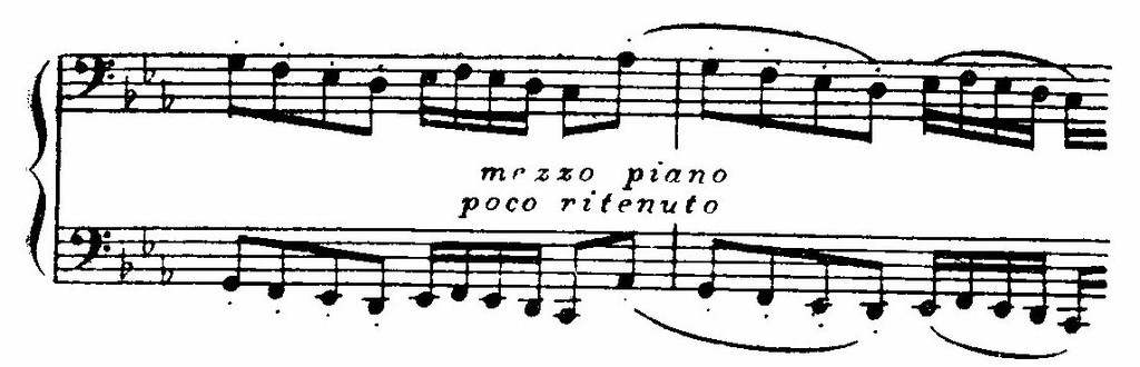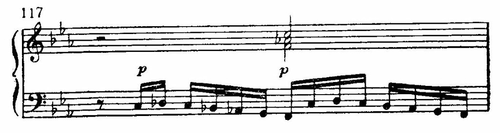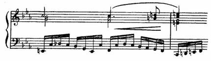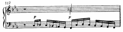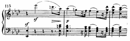 Развитие репризы (с т. 92) по-новому повторяет и претворяет старые моменты. Но теперь нет просветленного ля-бемоль-мажора. После того как оборвался на верхнем до взбегающий поток шестнадцатых (т. 13 от конца части), раздаются отрывистые удары аккордов, замечательно правдиво передающие иссякание порыва.