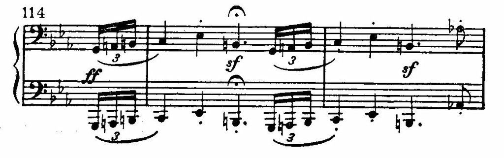 В т. 10 возвратилась энергия движения. Акцентированные восьмые подготавливают т. 11 с его типично бетховенскими sforzati и экспрессивными секундами. Затем все затихает, а рокочущая трель баса заставляет напряженно ждать.
