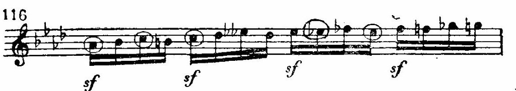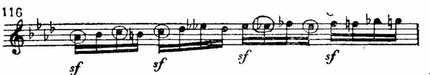 образец обильных хроматических обыгрываний — совершенно в духе романтиков (тоны обыгрываемого трезвучия отмечены на примере кружками). Начало разработки обнаруживает придавленность главной партии, которая здесь тихо и уныло ниспадает секвенциями. Дальше — фрагмент полифонии и кульминация на разработке хода главной партии (тт. 86—90), где особенно выделяется роль тревожно звучащих уменьшенных септаккордов. (Здесь, кстати сказать, использованы все три возможные вида уменьшенных септаккордов. Это приближение к технике трактовки данных гармоний романтиками.)