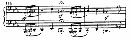 Он очень близко предвещает соответственный каданс этюда Шопена ор. 10 № 12. Дело тут не в случайном совпадении, а в родстве образов, в новом приближении Бетховена к романтическому мышлению. Как Шопен в конце своего этюда, так Бетховен в конце первой части сонаты op. 111 создает выразительный образ крушения, гибели бурных порывов, отзвуки которых растворяются в печально просветленном мажоре. Таков заключительный «приговор» Бетховена отголоскам былых бурь в этом позднем, скорбном и трагическом Allegro.