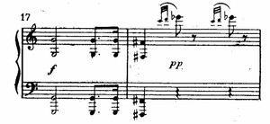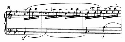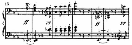 А дальше обращают внимание остро динамические синкопы и бурный рокот уменьшенного септаккорда в басу (тт. 79—80).