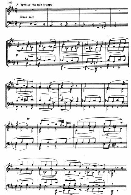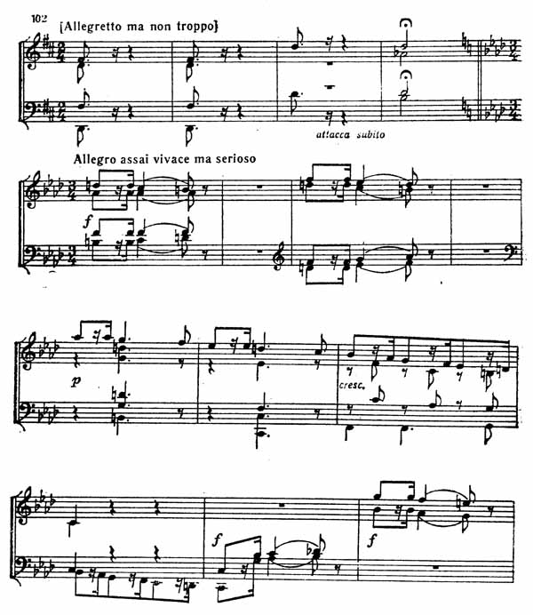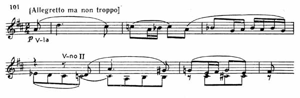 Первые четыре такта Allegretto начинаются мерными «шагами» виолончели: воцаряется серьезное настроение, которое выражается тихим, торжественным пением, постепенно разрастающимся, пока наконец оно не завершается фразой, полной глубокой задушевности. Обращает на себя внимание гармонический колорит этой мелодии, колеблющейся между двумя тональностями — g-moll и D-dur, причем каждый раз, когда D-dur как будто берет верх, происходит поворот в минор и общая картина вновь восстанавливается (пример 100).
