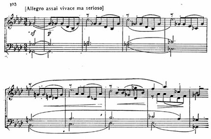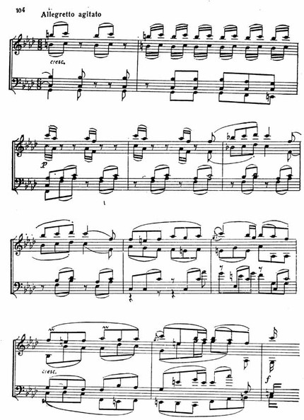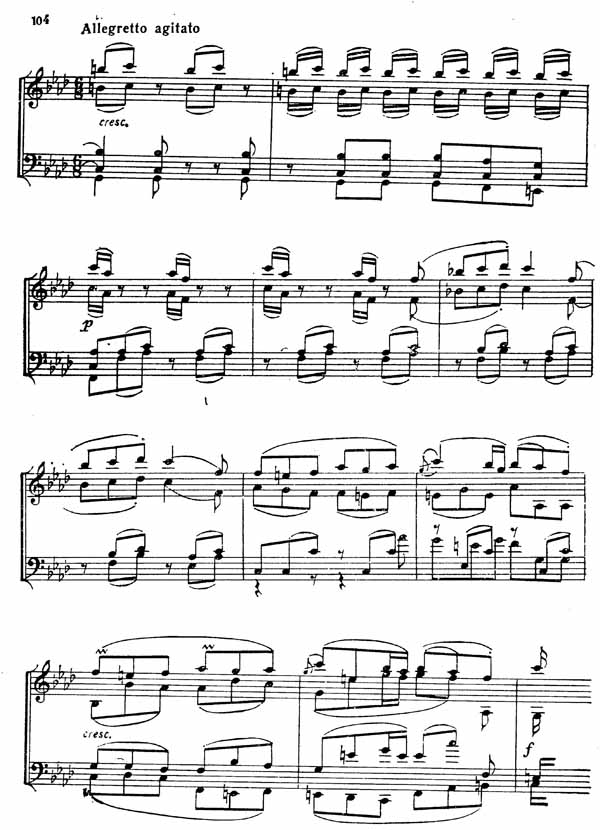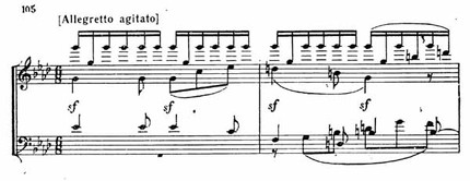 Быстрая часть финала (Allegretto agitato, 6/8, четверть с точкой = 92) разражается драматическим ураганом, звучит как симфония битвы. Главная партия состоит из трех существенно различных элементов. Первый — краткие напряженные возгласы; во втором звучит настойчивая жалоба; третий еще более усиливает выразительность всей этой темы (пример 104).