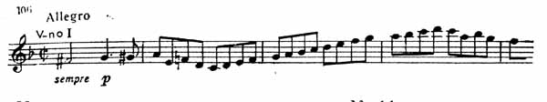 После многозначительных фермат опять звучит мелодия главной партии, энергичное развитие которой приводит к новому бурному разделу. Как раскаты грома, в средних голосах звучит новая фигура шестнадцатых, в то время как у первой скрипки и виолончели слышатся короткие четвертные ноты и аккорды, которые точно стрелы пронизывают воздух. Но вот буря понемногу утихает, и вместе с этим появляется побочная партия, полная бетховенской энергии (пример 105).