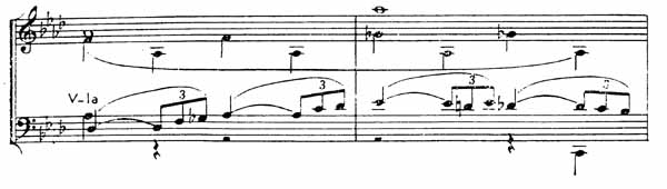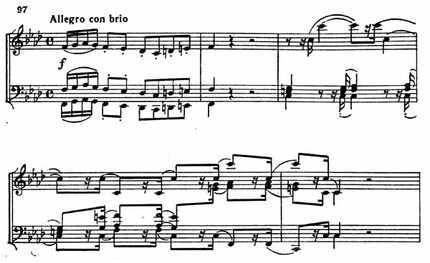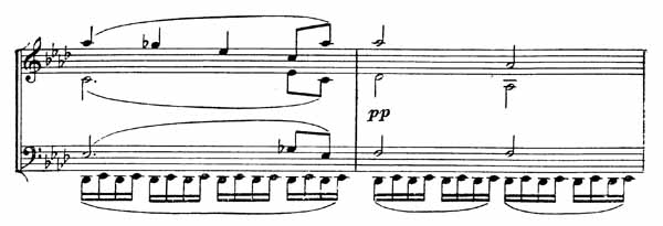 Но вот тихо вновь возникает тема фугато у альта. Это начало коды; тема фугато постепенно затихает и наконец совсем исчезает, и только теперь с задушевностью и нежностью может вновь прозвучать первая певучая мелодия.