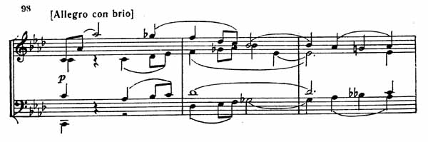 Предельно лаконичная, трехтактная связующая партия подводит к побочной партии. Тема побочной партии отличается проникновенной лиричностью (пример 98).