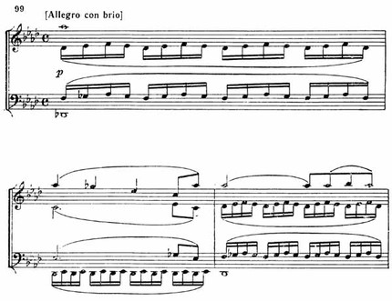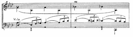 Внезапно со сдвигом в A-dur все голоса в бурном порыве устремляются кверху, но этот взлет неожиданно обрывается, и уже в следующем такте в тихой звучности спокойно и задушевно возвращается Des-dur. Появляется заключительная партия, сопровождающаяся затаенными отзвуками начала главной партии у второй скрипки и альта, а затем у одной виолончели. Опираясь на эти голоса, скрипка ведет свою чудесную мелодию (пример 99).