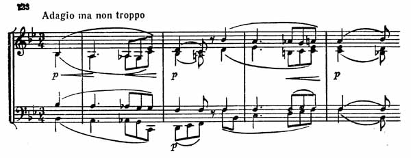 После двух вступительных тактов — октавных скачков альта — первая скрипка исполняет pianissimo главную тему народного характера. Она начинается в доминанте c-moll и через четыре такта переходит в доминанту B-dur, лишь в восьмом такте как бы мимоходом случайно задевая тонику главной тональности. Таким образом, тема эта (пример 137) тонально неустойчива.