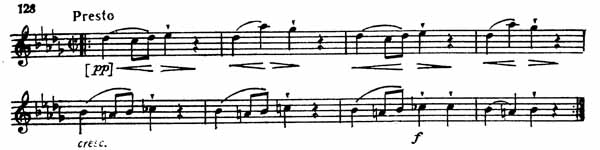 Приведенный пример дает ясное представление о фактуре Presto. Затем следует шеститактный период, по характеру музыки соответствующий первому (пример 128).
