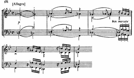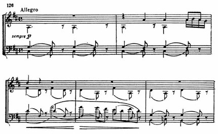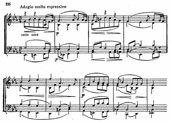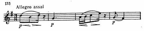 Широта и непрерывность мелодии достигается здесь главным образом заполнением цезуры скрипичной темы путем полифонического движения сопровождающих голосов.