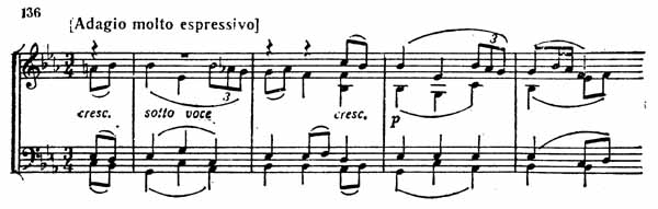 В каватине звучит одна бесконечная мелодия (пример 135), вылившаяся из глубины души песня, которая трогает наше сердце буквально каждой своей нотой.