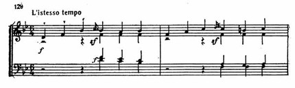 Вторая особенность заключается в аккомпанементе, проводимом нижними голосами: три ноты в каждой второй половине такта. При крайне возбужденной и вместе с тем однообразной ритмике, при резких акцентах на относительно сильной доле такта это трио производит впечатление какой-то демонической музыки.