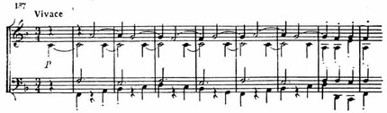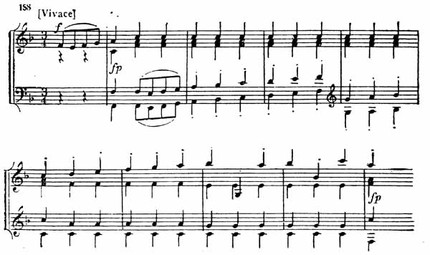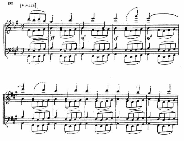 Появляется заключительная фигура, сопровождаемая указанием pianissimo у всех инструментов. Весьма оригинальным образом она повторяется восемь раз. Происходит модуляция в A-dur, вновь звучит вся восьмитактная начальная тема, но теперь она не повторяется, а с девятого такта уступает место чудесному переплетению голосов и мотивов. Это происходит на протяжении двенадцати тактов, а затем начинается поразительный эпизод. У первой скрипки звучит смелая, с широчайшими скачками мелодия, сопровождаемая фигурой из четверти и четырех восьмых (пример 189), которые в тройных октавах повторяются пятьдесят раз! Здесь неистовство поистине безудержно.