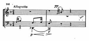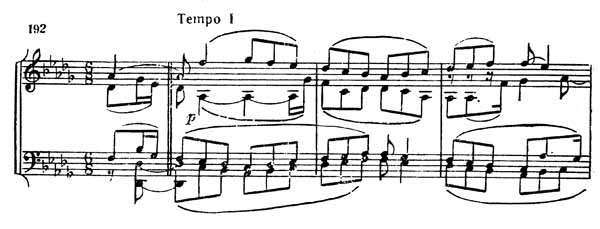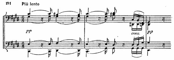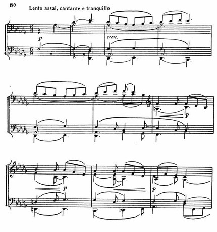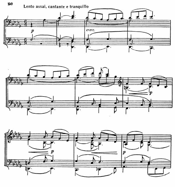 В тишине почти неподвижной атмосферы, которую создает в нескольких тактах вступления аккомпанемент на одном аккорде, звучит прекрасная непрерывная линия мелодии. В первом изложении в ней слышится только умиротворение, но при повторении уже проявляется некоторая сдержанная печаль (пример 190).