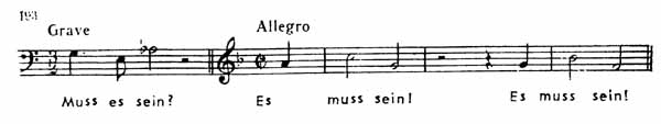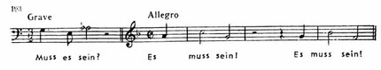 Словами «Muss es sein?» Бетховен задает тревожный вопрос судьбе, который все настойчивее и настойчивее повторяется во вступлении (Grave ma поп troppo tratto, 3/2).