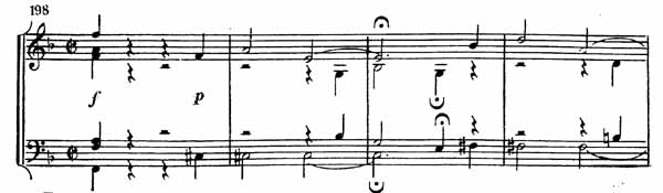 Но чем мрачнее и страшнее было впечатление от вопроса, тем светлее и яснее становится горизонт, как только возвращается ответ, то есть Allegro F-dur. Оба его тематические элемента чудесным образом соединяются в оживленную мелодию, которая излагается в виде четырехголосной канонической имитации (пример 197).