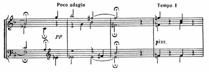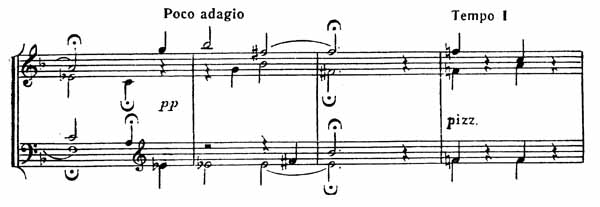 Трудно сказать, что следует принять за тему: острые четверти виолончели или же протяжные ноты первой скрипки, каждый раз приходящиеся на слабые части такта. Все как покрывало закрыто протяжными нотами, двигающимися вверх и вниз в диапазоне терции; при этом получается очень своеобразное звучание, похожее на гармонику.