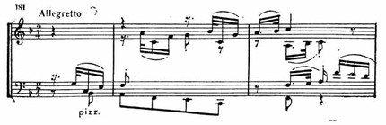 Эта фраза повторяется, причем шутливое эхо первой скрипки неожиданно сменяется sforzato обеих скрипок. Далее следует мотив, переходящий от голоса к голосу и сопровождаемый pizzicato виолончели (пример 181).