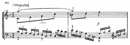 Тема побочной партии состоит из двух элементов, один из которых образуется восходящими отрывистыми восьмыми, а другой — триолями шестнадцатых (пример 185).