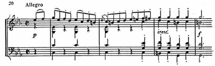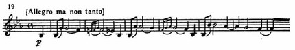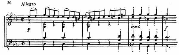 Для экспозиции в целом характерно большое разнообразие тематического материала и его структурная завершенность. Так, первый раздел связующей партии, являясь по существу расширенным дополнением к главной партии, представляет собой нечто обособленное: лишь на мгновение промелькнула новая тональная краска Es-dur (такт 17), но в целом связующая партия тонально замкнута, она останавливается на доминанте главной тональности как на предыкте к следующей теме. Начало побочной партии прямым сопоставлением вводит As-dur (пример 19).