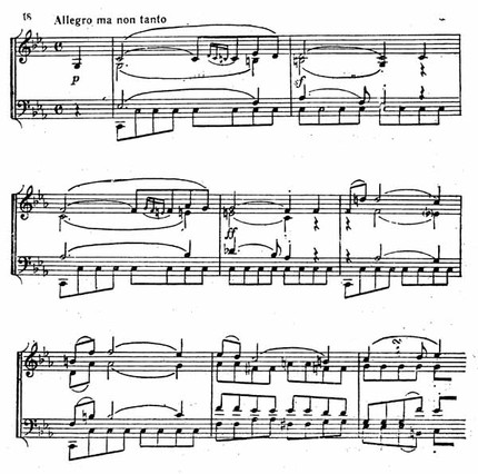 Разнообразная гамма чувств, порожденных этими переживаниями, нашла свое глубокое выражение в первой части квартета (Allegro ma non tanto, 4/4, половинная по метроному = 84). Главная партия полна затаенной скорби, она требует сдержанной мужественной передачи. Своеобразна она и по форме — тринадцатитактовый замкнутый период, включающий и элемент мотивного развития (пример 18).