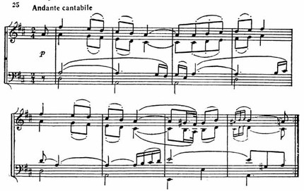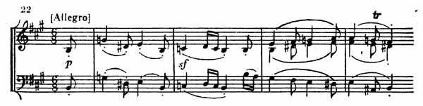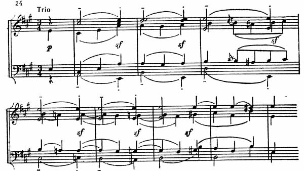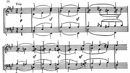 Музыка второго раздела менуэта плавно движется вплоть до внезапной, прерывающей ее течение генеральной паузы. После этого вновь проводится первый раздел в несколько расширенном виде. В трио менуэта звучит одна из задушевнейших мелодий (пример 24), подобная тем, которые имеются в теме с вариациями фортепианной сонаты As-dur op. 26 и в третьей части фортепианного трио Es-dur op. 70.