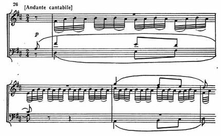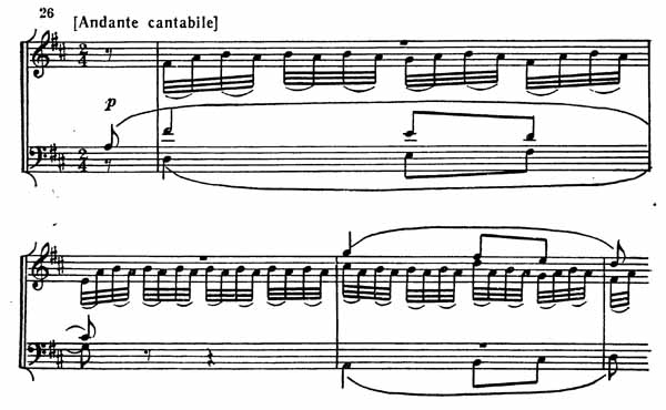 Остановимся лишь на некоторых, наиболее характерных разделах этого вариационного цикла. Прекрасна третья вариация с ее точно убаюкивающими фигурациями тридцатьвторых у скрипок, которым противопоставлено проведение свободно преобразованного тематического материала у альта и виолончели (пример 26).