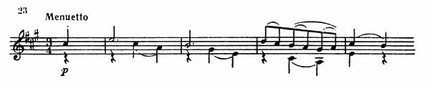 Вторая часть — менуэт (Menuetto, половинная с точкой = 76), проникнутый моцартовским духом (см. пример 23).