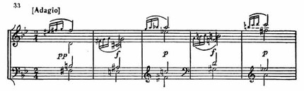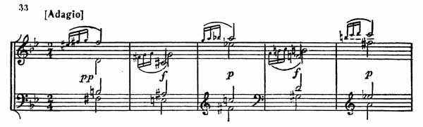 Повторение первого четырехтакта в более низком регистре придает теме мрачное звучание. Затем та же тема модулирует в h-moll, при этом образуется цепочка из четырех уменьшенных септаккордов (см. пример 33).